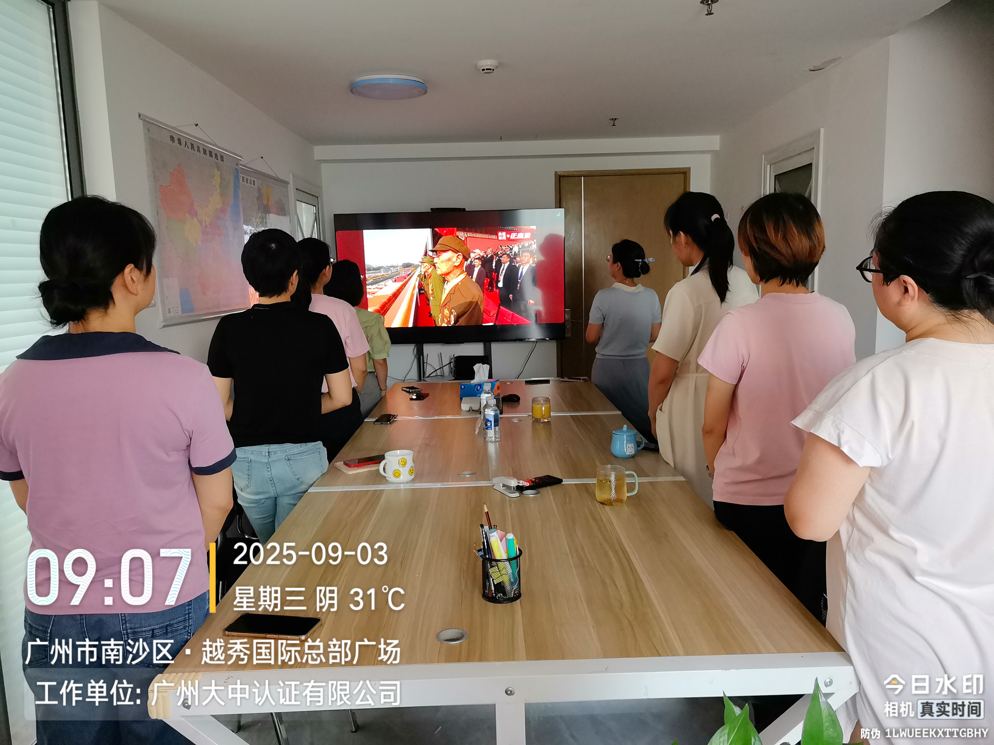 2025年9月3日上午,广州大中认证有限公司组织观看纪念中国人民抗日战争暨世界反法西斯战争胜利80周年大会,高唱国歌。